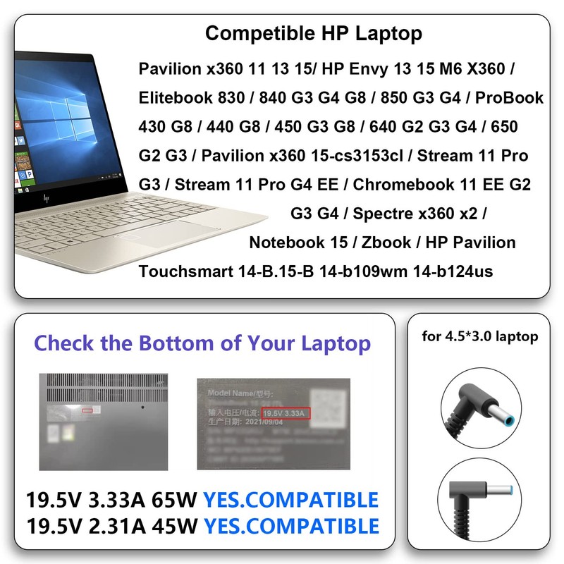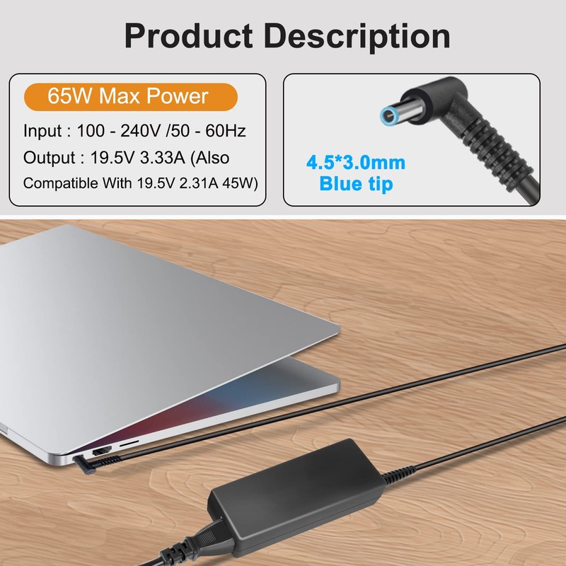 Product description: PAEBAI+ 65 W HP laptop charger. Product description: input: 100 - 240 V / 50 - 60 Hz output: 19.5 V 3.33 A 65 W (also compatible with 19.5 V 2.31 A 45 W) connection size: 4.5 x 3.0 mm blue tip. PLEASE CONFIRM THE SPECIFICATIONS OF YOUR HP POWER ADAPTER BEFORE ORDERING.