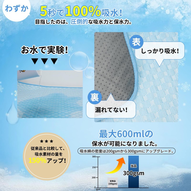 - (4-layer fully waterproof and anti-slip rubber sole for safe use) The 4-layer high density hybrid fabric for pet cooling mat maximizes water absorption. The unique design combines the water absorbing layer, waterproof layer, antibacterial layer, and cooling layer, instantly absorbs up to 20.3 fl oz (600 ml) of water in one wash. The dog cooling mat is designed with reinforced edge stitching for side leakage and a non-slip silicone gel bottom to prevent the mat from shifting and shifting even with active dogs. ?Thoroughly protects your pet's safety. Also great for potty training for nursing dogs and relieving stress for multiple breeds. This is a highly durable dog cooling mat that maintains its cooling performance even after washing