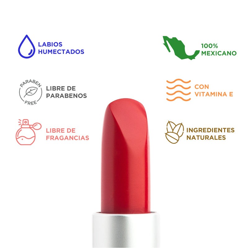 Labial en barra "Toloache" con un acabado semi mate, color intenso, enriquecido con ingredientes naturales, que se funden al contacto para una sensación humectante y cómoda.