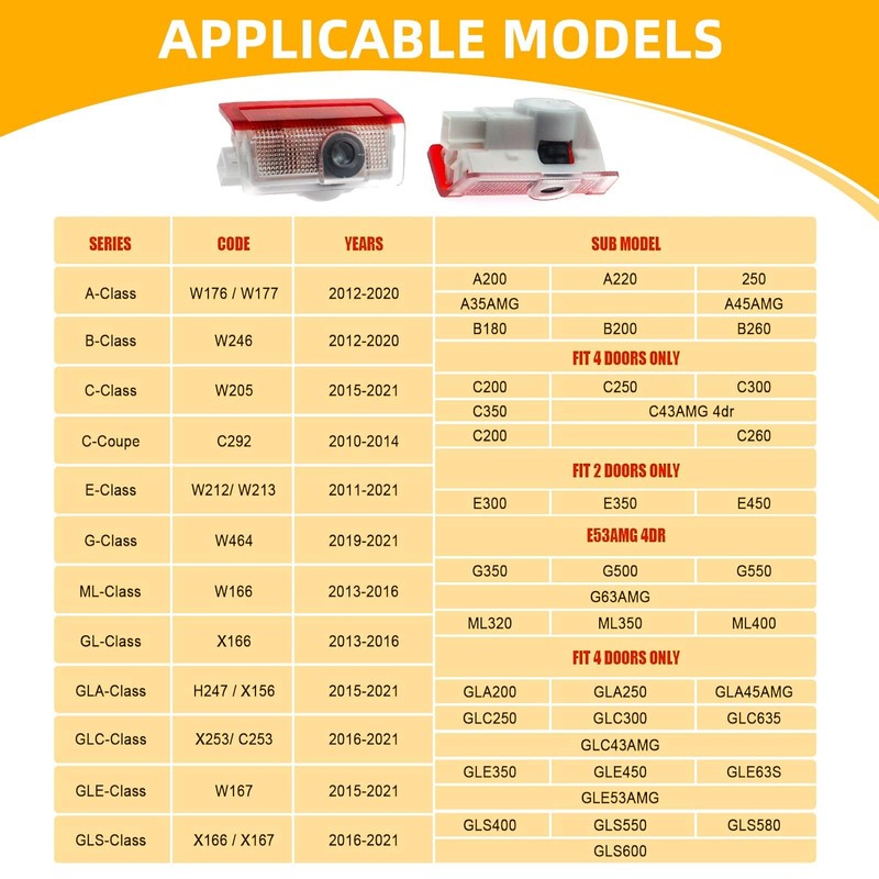 - Broad Compatibility: These car door projector lights are designed for -z vehicles, functioning as mercedes door projector light and -z welcome light. They fit various Mercedes models without requiring additional decoders, ensuring a seamless match. As a practical car door light logo projector, it is recommended to check your vehicle’s door light setup for optimal fit