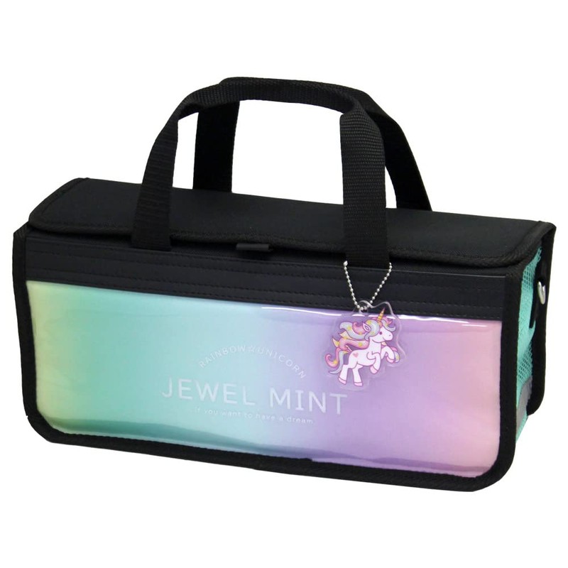 - A cute bag with a mint green and rainbow pattern. Vinyl fabric on the front, mint green is fabric. Includes a cute unicorn keychain