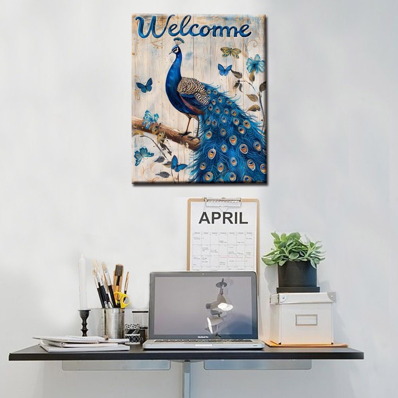 Paint by Numbers Kits 16x20inch Canvas DIY Abstract Animal Blue Peacock Oil Painting for Kids, Students, Adults Beginner with Brushes and Acrylic Pigment-Welcome Sign Wooden Background(without Frame)