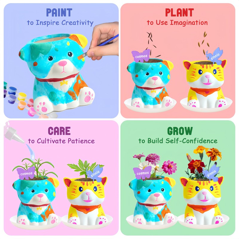 Paint & Plant Flower Growing Kit for Kids - 4 Set DIY Animal Pattern Ceramic Painting Kit, Kids Gardening Set, Arts & Crafts for Ages 8-12, Birthday Gifts for 6 7 8 9 10 11 12 Year Old Girl