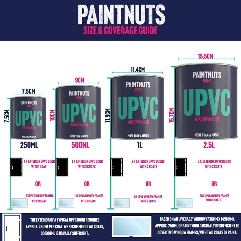 PaintNuts uPVC paint is specially formulated for uPVC and plastic surfaces. Our PURE WHITE (RAL-9010) uPVC Paint has excellent adhesion and coverage, ultra-fast drying times and provides an extremely tough, durable finish that's weatherproof and UV resistant Available in any RAL or Pantone colour - each in a matt, satin or gloss finish - you now have the freedom to stamp your style on your property in pretty much any colour of your choice. No primer, hardener or thinner is required, so it's super simple to use and ready to go when you are. Ultra-fast drying times help to avoid any contamination from dirt or dust blowing in the wind. It's suitable for either brushes or rollers and is also available as an aerosol. For professionals and keen decorators, it's even suitable for use with a spray gun (thinning is recommended for spray gun application). One litre is enough to cover 10 - 12sqm in a single coat when using a paint brush or more when sprayed. PaintNuts uPVC paints come in a range of sizes starting from 250ml tins or 400ml spray cans.