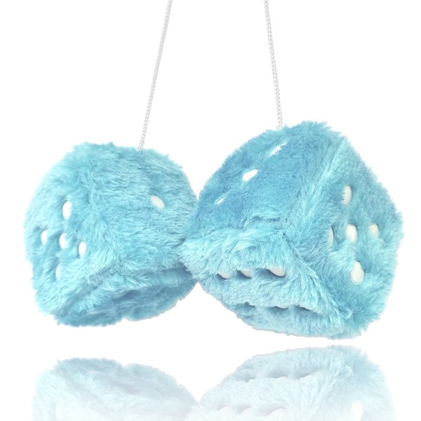 Fuzzy Plush Dice for Car Mirror, Pair of Retro 3” Light Blue Dice with White Dots for Car Interior Hanging Ornament Decoration (Blue)