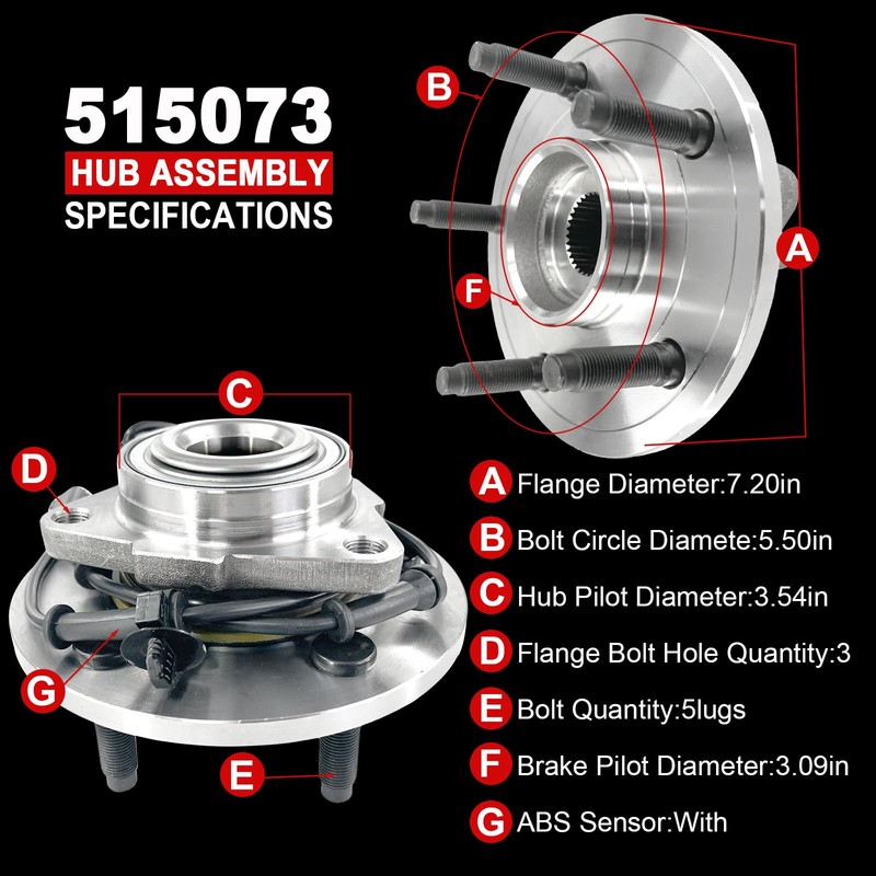 • SPECIFICATION - ①Position: Front Left and Right Axle; ②Flange Diameter: 5.53; ③Bolt Circle Diameter: 4.5; ④Hub Pilot Diameter: 2.91;⑤Flange Bolt Hole Quantity: 4; ⑥Wheel Stud Quantity: 5; ⑦Brake Pilot Diameter: 3.15; ⑧ABS Sensor Included: Yes