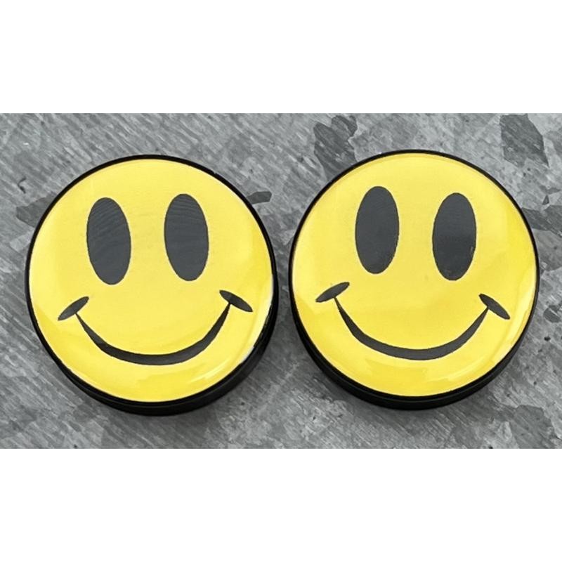 PAIR of Bright Yellow Smiley Face Logo Double Flare Acrylic Saddle Plugs - Gauges 8g (3mm) thru 1&3/16" (30mm) available! - Gauge (Thickness): 1&3/16" (30 mm)