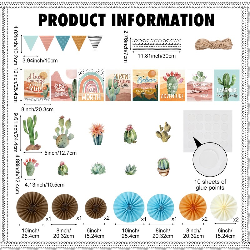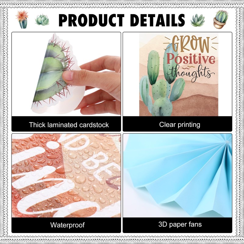 - Growth Mindset Classroom Decor: our classroom bulletin board sets include 8 motivational posters, 10 3D paper fans, 10 flag cards with a 1.5m twine, 10 cactus and succulent paper cutouts, 24 bulletin board borders and 10 glue points; The rich quantity and inspirational words are suitable for creating a positive learning atmosphere