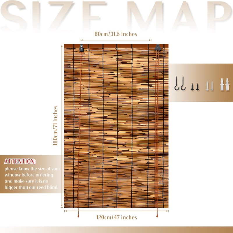 - 【ABOUT SIZING】- Natural bamboo roller blinds size: 47 (W) x 71 (H) inches. To ensure the size fits your window. Please read the size info. carefully before purchasing. If your window is large in size, it’s recommended to get 2 natural reed window or more pieces.