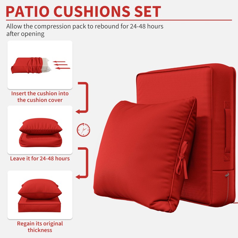 - đź’ˇABOUT THE PRODUCT - Our seat and back cushions feature a universal design compatible with most deep outdoor seating. Delivered in a compressed package, they fully expand within 24-48 hours. For any issues, contact us for a resolution within 24 hours!