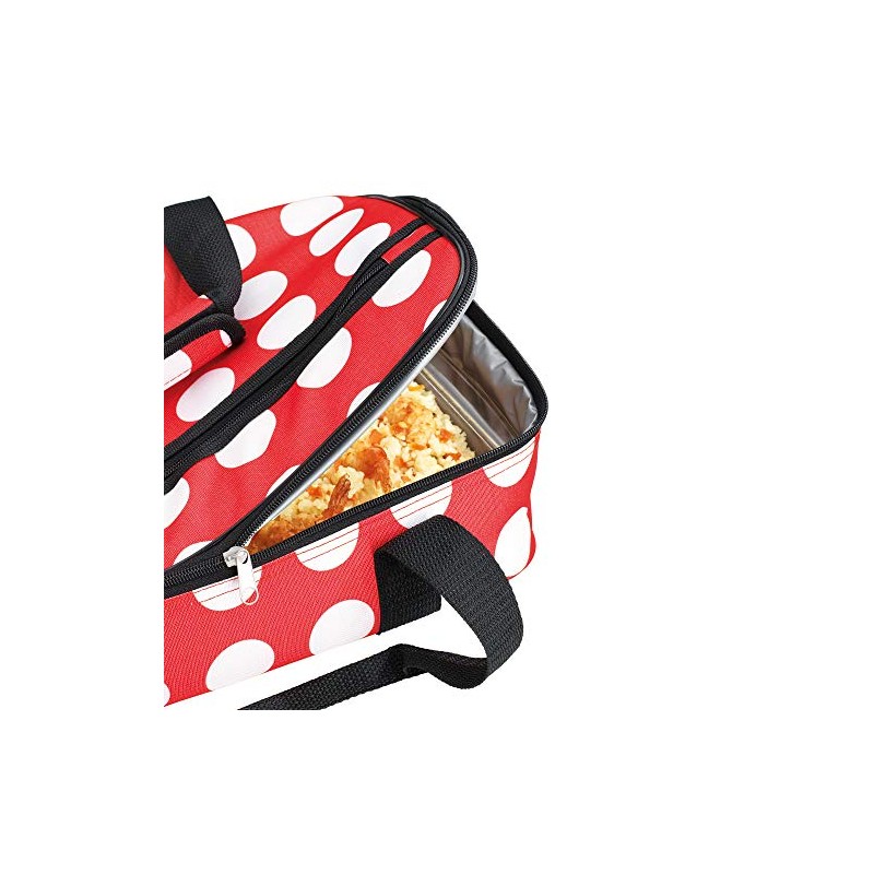 Palais Dinnerware Insulated Casserole Carrier - With Zip Closure - Attractive Design, with Strap and Side Pocket (White Dots on Red)