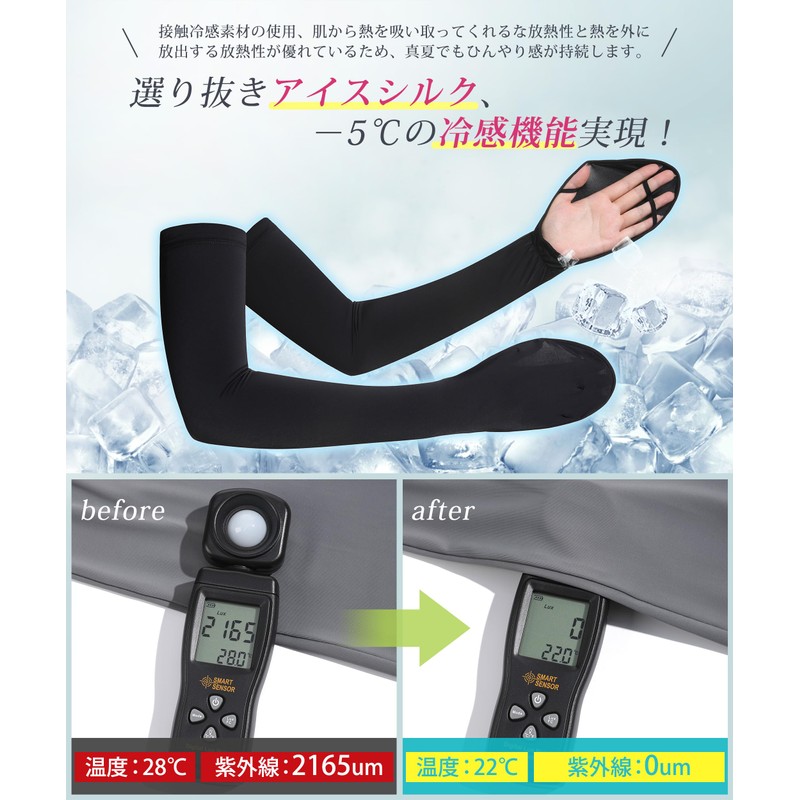 - (Cool Feeling/Great for Hot Days) Arm cover made with cold fabric for women that feels cool to the touch - 5 degrees Celsius! Provides instant cooling sensation. When wet with water or sweat, it has a cooling effect due to the vaporization heat and the temperature drops as soon as it comes into contact with your skin, and it will continue to cool down. Arm cover for women is perfect for spring, summer and autumn. In addition, the fabric made of ice silk, the women's arm cover is not only soft and breathable, but also wrinkle resistant and can be washed repeatedly. It has excellent moisture absorption and sweat absorption, so it won't get stuffy in the summer and is gentle on the skin