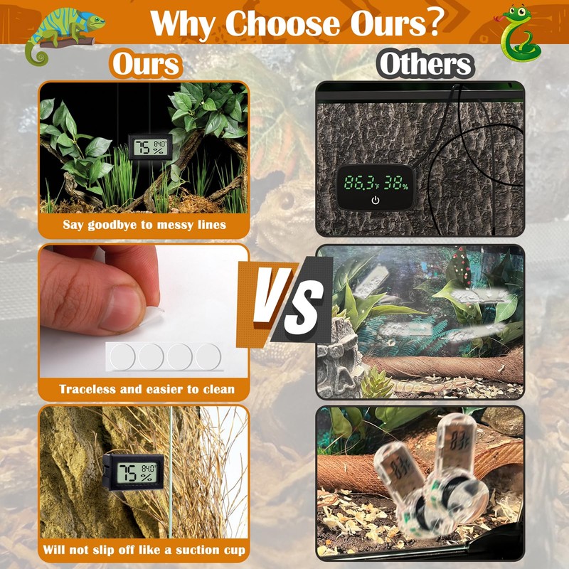 - With transparent acrylic dot glue: Say goodbye to messy wires, the reptile thermometer and humidity gauge is equipped with an AG13 button battery, so you don't have to worry about power outages. It is also equipped with 4 transparent acrylic dot glue and can be installed anywhere you want. And the transparent acrylic dot tape adopts a traceless design, which is easy to clean and will not cause stains like traditional double-sided tape. Compared to thermometers with suction cups, it won't fall off and scare your pet.Please use the matching adhesive tape to stick the thermometer and the wall together
