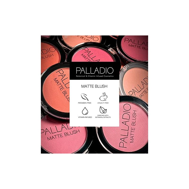 Palladio Matte Blush, se aplica suavemente sobre las mejillas, apariencia mate suave y acabado uniforme, cobertura aterciopelada impecable,...