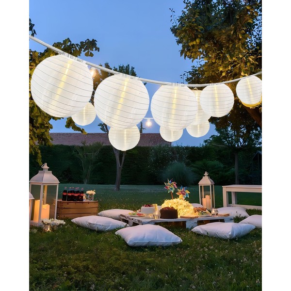- Captivating Illumination: 25FT white paper lantern is adorned with LED G40 lights, providing a beautiful and ambient lighting experience.Package contains 10pcs white nylon lantern lights, 11pcs G40 LED bulbs.Whether you're hosting a party, wedding, or simply want to add a touch of elegance to your space, lantern lights will be the perfect addition.