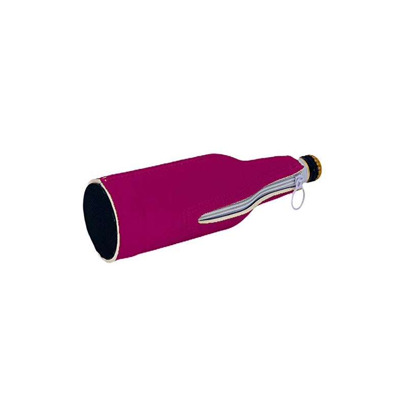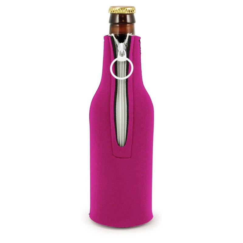 Made of 1/8" (3mm) neoprene (similar to a wet suit) material. Full glued in non-skid rubber bottom. Built for regular 12 oz long neck beer bottles. Zipper on reverse side for easy access. Keeps beer colder longer and hands dry. Helps prevent surface damage by limiting condensation. Graphic is a durable vinyl heat transfer.