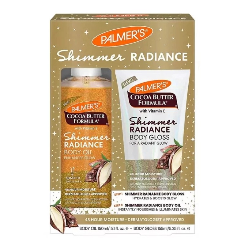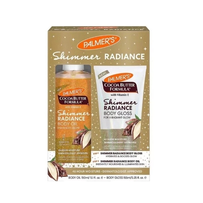 • Set with one 5.1 oz. Palmer's CBF Shimmer Radiance Body Oil, one 5.25 oz. Palmer's CBF Shimmer Radiance Body Gloss