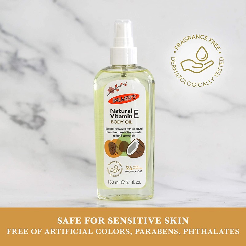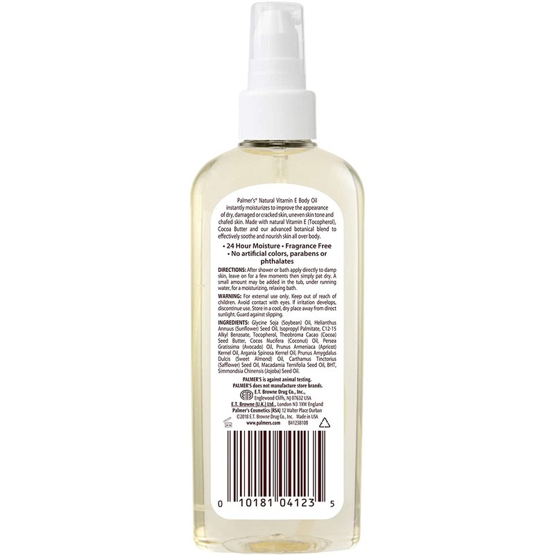 - Body Oil: Palmer's Natural Vitamin E Body Oil is a multi-purpose formulation that instantly moisturizes to improve the appearance of dry, damaged or cracked skin, uneven skin tone and chafed skin. This lightweight formula absorbs quickly to lock in moisture