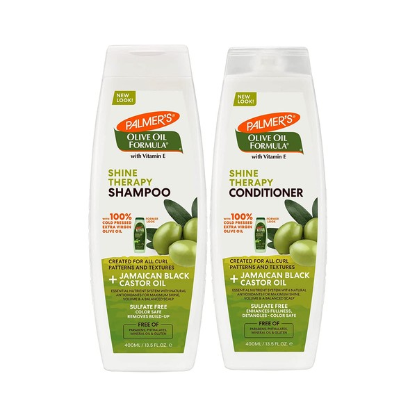 - Palmer’s Olive Oil Formula Shine Therapy Shampoo (400ml): Perfectly nourishes dull, frizzy hair and dry scalp to maximize fullness and improve manageability, for irresistibly soft and shiny hair. Olive Oil helps to soothe the skin and restore hydration for a healthy, nourished scalp. Helps rid the scalp of environmental toxins creating an optimal foundation for growing hair. Jamaican Black Castor Oil locks in moisture and promotes fuller strands. No harsh detergents, sulphate free, colour safe.