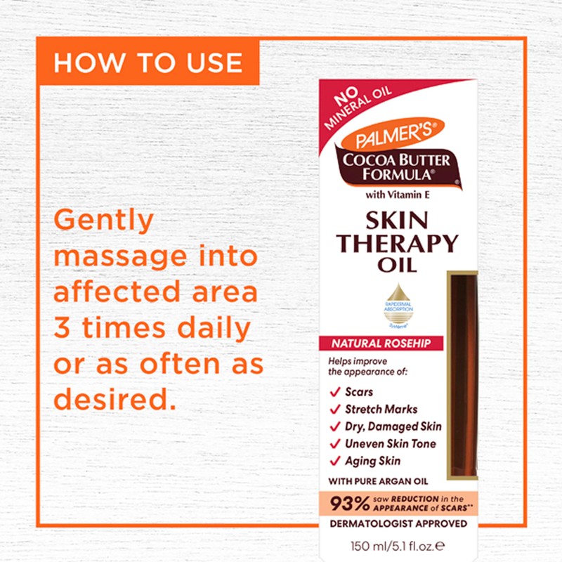 You've heard of using creams and lotions to help your skin stay hydrated or heal dry, damaged skin, but have you considered moisturizing body oils? Some of the best body oils for glowing skin have naturally-derived ingredients, including cocoa butter, coconut oil and argan oil. The Palmer's Skin Therapy Oil collection harnesses all of the cocoa butter benefits and blends it with other skin-loving ingredients to hydrate and pamper your skin. Cocoa butter is a natural emollient that works well for moisturizing skin and aiding with scar lightening, while Vitamin E is rich in antioxidants and helps to heal damaged skin. When blended together they help to minimize scars and keep skin hydrated and healthy-looking. Not only is Skin Therapy Oil one of the best oils for dry skin on the body, it also helps improve the appearance of imperfections. A staple in many women's skin care routines, this advanced multi-purpose dry oil is rich in essential fatty acids, vitamins and antioxidants to perfect skin all-over-the body by improving the appearance of stretch marks, scars and dry, damaged or uneven skin. Try the Palmer's Skin Therapy Body Oil in the original or rosehip fragrance for hydrated, glowing and perfected skin. Suitable for eczema-prone skin.
