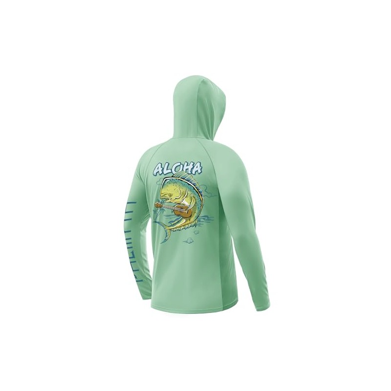 Palmyth Fishing Shirts for Men Long Sleeve Sun Protection Hoodie with UV UPF 50+ Neck Gaiter Seafoam Mahi Ukulele Large