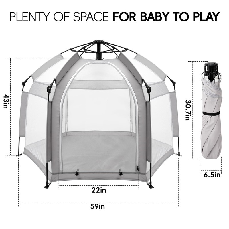 Palopalo Pop Up Baby Playpen with UPF50+ Canopy, Indoor & Outdoor Foldable Play Pen for Babies and Toddlers, Portable Baby Beach Tent with Travel Bag, Pop Up Pack and Play Yard, Grey