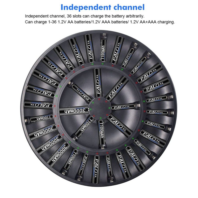 - Independent Slot - AA, AAA smart battery charger offers 36 different channels allowing you to charge any combination of 1.2V AA/AAA NIMH/NICD rechargeable cells. Includes a worldwide 100~240v AC adapter,Eliminate the need for multiple household AA/AAA battery chargers.