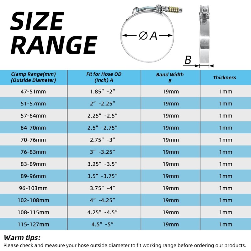 - Capacidad de sujeción real: abrazadera de manguera de tornillo en T de 5 pulgadas, rango de trabajo de 115-127 mm para manguera de 5 pulgadas de diámetro