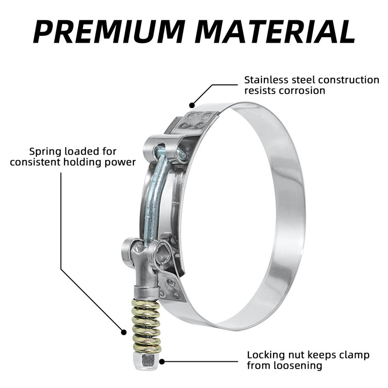 - Carga de resorte: la abrazadera de tornillo en T está diseñada con un conjunto de resorte para una potencia de sujeción constante. El tamaño de la abrazadera se puede extender y contraer controlando el tornillo para facilitar la instalación y sujeción del tubo