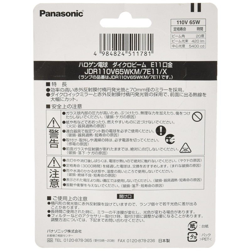 Panasonic Halogen Light Bulb JDR110V65WKM7E11X; Color Name: Halogen Bulb for General Lighting; Release Date January 01, 2003; Internal Dimensions: **(3.9 oz (99 g); External Dimensions: 4.3 x 5.9 x 10.4 x 10.4 mm (660 g); Height x Width x Depth (Weight); Dichrome Beam (11111110 V). E11. Base: 2.8 inches (70 mm) diameter glass with 100 shape medium angle ● As this is limited by manufacturer stock, please accept in case of selling out at the time of your order.