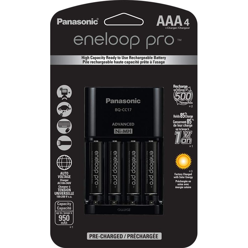 - SECURE, PROTECTIVE PACKAGING: This package contains four eneloop pro AAA rechargeable batteries (made in Japan) and one CC17 charger, packaged together in the U.S.A.