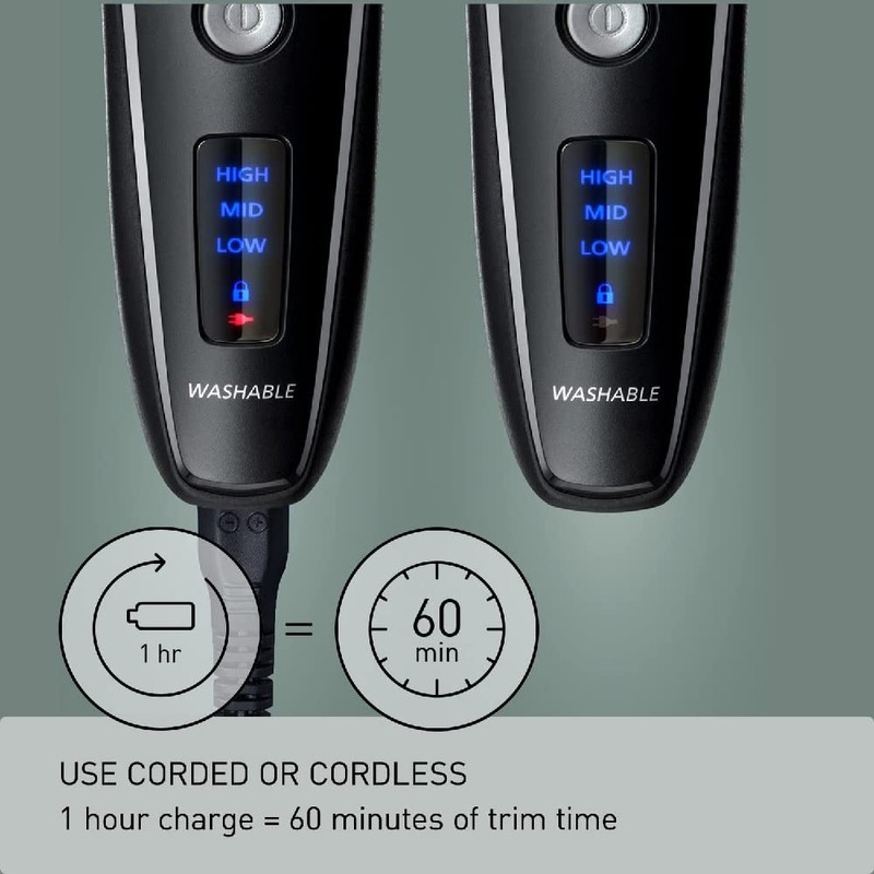 - Cordless/corded operation: Use the trimmer cordless anytime, anywhere for up to 60 minutes with rechargeable battery power or plug in for longer use; Includes comb attachment, cleaning brush, blade oil, AC adapter/charger and universal voltage for international travel (AC 100-240 V)