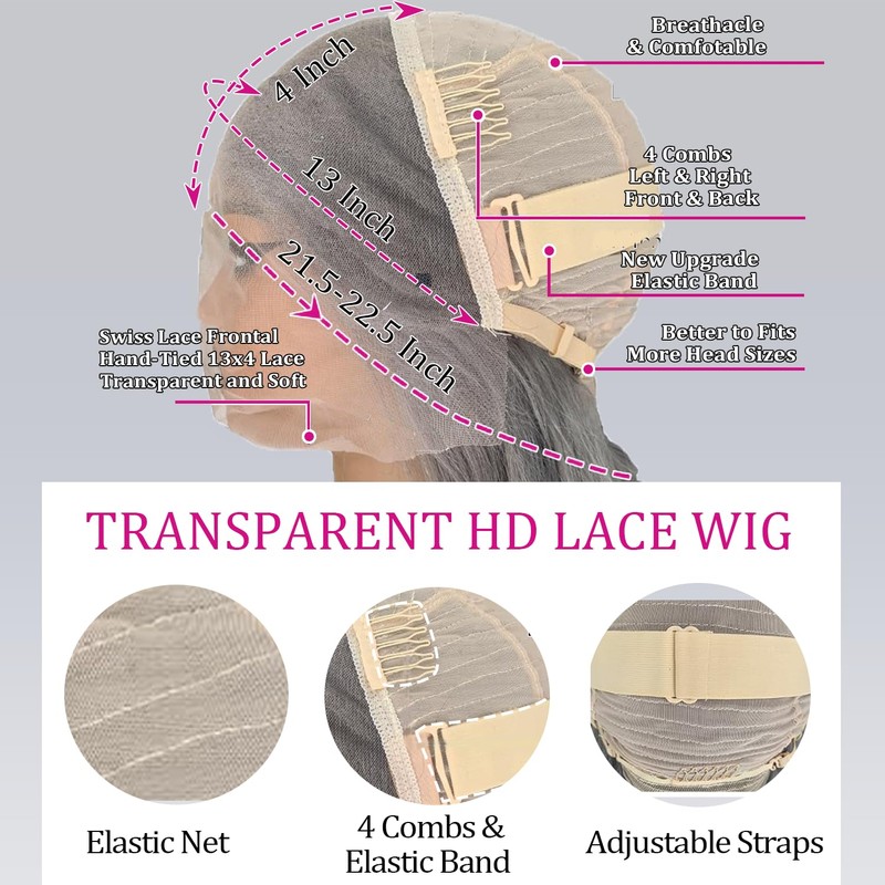 - Straight Grey Lace Front Wig Cap: 13x4 Regular Adjustable Cap Size (21.5-22.5 inch), Suitable for Most Head Circumference, Soft and Breathable. 4 Combs,2 Adjustment Straps and A Wide Elastic Band Make Wearing More Comfortable and Secure