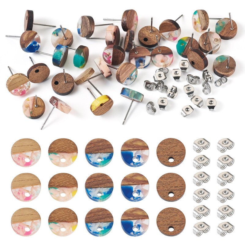 PandaHall 30 Pieces Resin Wood Stud Earrings, 10mm Flat Round Wooden Stud Earrings, Earring Pin with Nuts for Pierced Dangle Earrings Jewelry Making