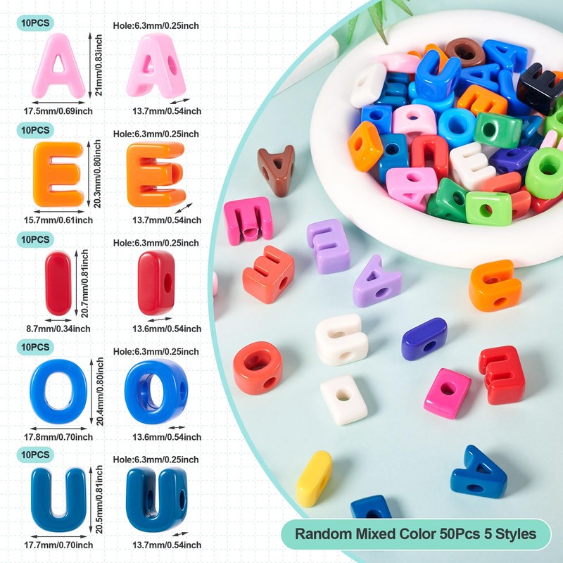 Pandahall 50Pcs Acrylic Vowel Letter Slider Charms Chunky Alphabet Letter Bead Charm Rainbow Color Large Initial Charms for Wristbands Bracelets Necklace Choker Jewelry Making, Acrylic, No Gemstone