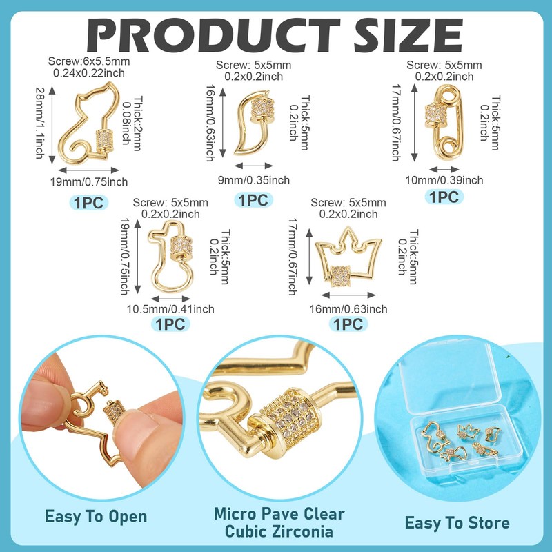 Pandahall 5Pcs 18K Gold Plated Screw Carabiner Lock Charm Clasps Brass Cubic Zirconia Jewelry Carabiner Bottle Crown Cat Necklace Clasps for DIY Bracelet Keychain Jewelry Making