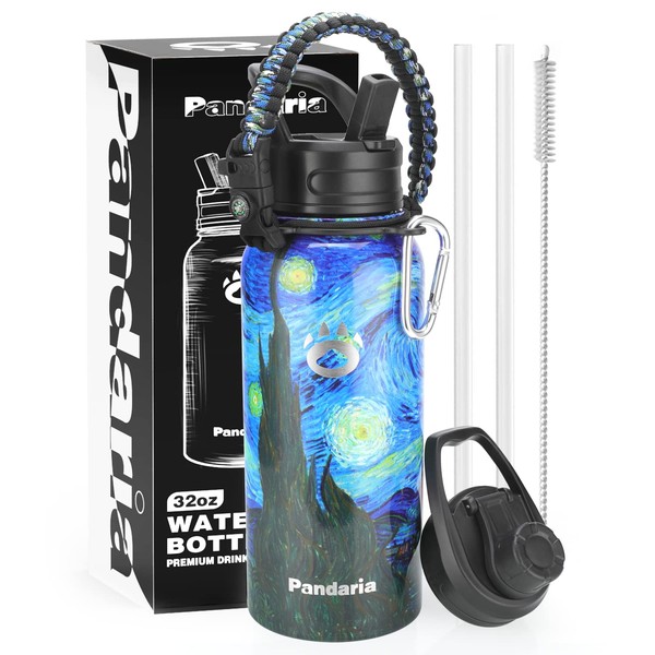 Pandaria Insulated Water Bottle 32oz, Stainless Steel Water Bottle with Straw & Spout Lids & Paracord Handle, Reusable Water Bottle Spill Proof BPA-Free Flask for Sports, Gym, Travel, (Starry Night)