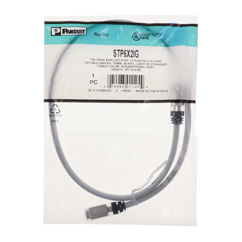 PANDUIT STP6X2IG CAT6A SHIELDED PATCH CORD CABLE, RJ45, GRAY, 2-FEET