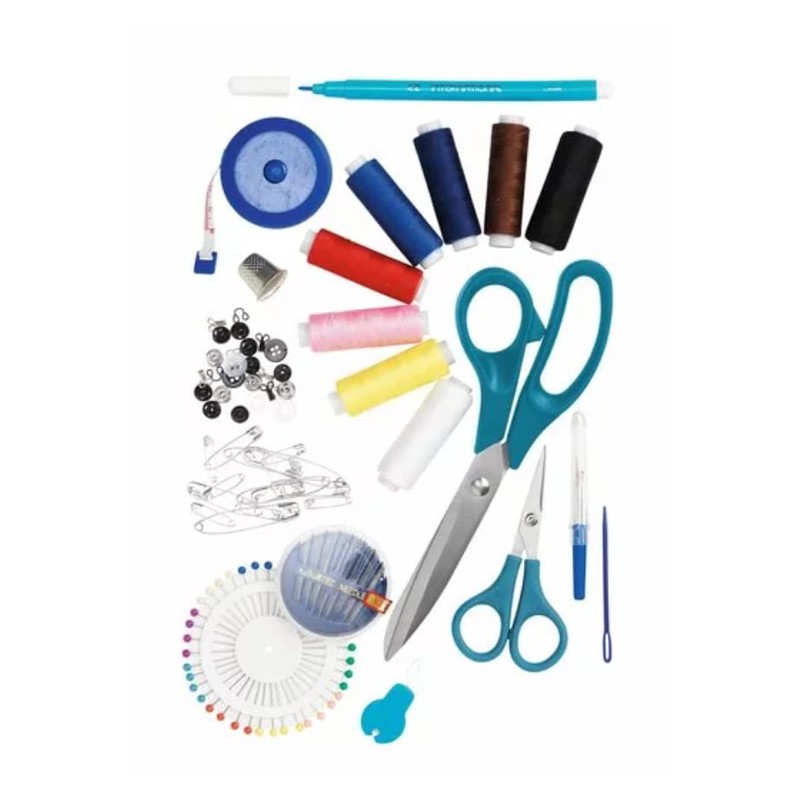 - Sewing kit contains: stored in tin box, textile scissors, sewing scissors, safety pins, buttons and hooks, tape measure 150 cm, button pins, thimble, sewing needle, press stud, self-dissolving marker pen, coarse sewing needle, needle threader and sewing thread 150 meters (white, yellow, pink, red, light blue, dark blue, brown, black).