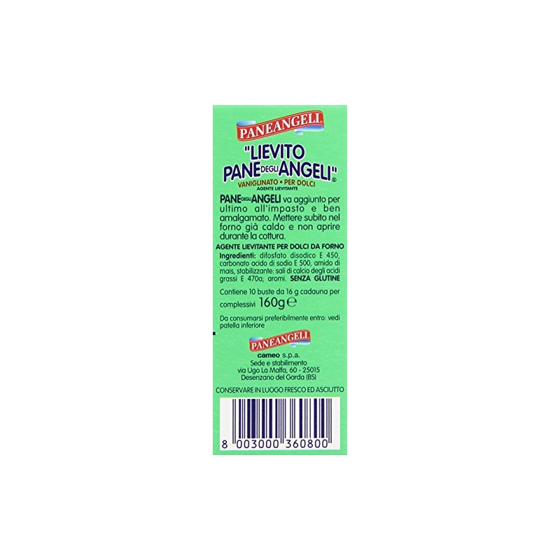 10 (16gr) packets | Translated into English, il Lievito Pane Degli Angeli means "the yeast bread of angels" - and was developed by the company Paneangeli. It is a leavening agent with vanilla for making cakes.