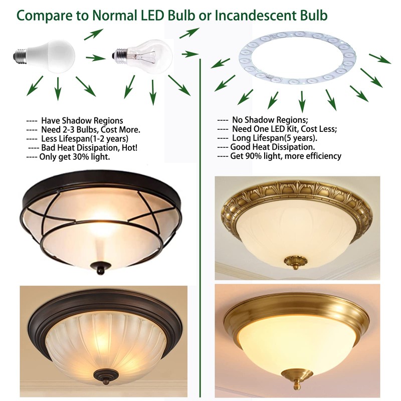- Distribución de luz perfecta, más brillante que las bombillas normales: el kit de luz de 18 W tiene 36 LED que se extienden alrededor del panel uniformemente, equivalente a una foco incandescente de 100 W, por lo que la distribución de la luz es perfecta y muy brillante. En su lugar, las bombillas LED normales tienen menos LED, y cuando se instala en la lámpara de techo, es paralela en lugar de mirar hacia abajo, por lo que la luz no se distribuye completamente hacia abajo creando alguna región de sombra.