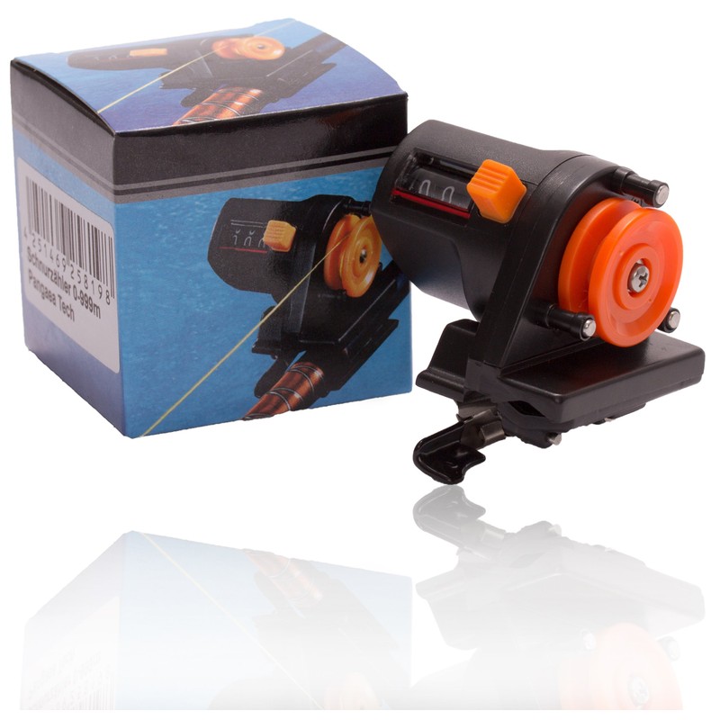 The depth gauge is mounted on the top roller and cord so that the depth indicator is clearly visible (orange wheel in the direction of view on the right. The fishing line is then placed around the impeller once in such a way that the line arrives on the top of the wheel and goes off. The fishing line must run inside the line guide device so that it is not damaged. A drawing for the correct insertion of the cord is attached to the product packaging.