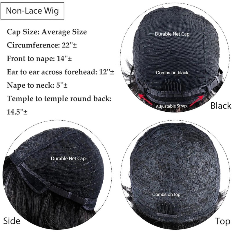 Advantage: No lace no glue needed short hair wig with bangs, no need to take time on hairline, very easy to install, just put on on and go!