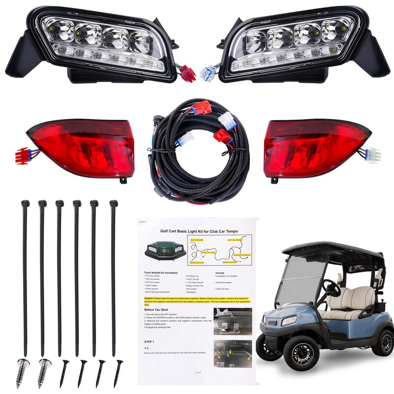 - Tempo Led Light Kit: LED lights use less energy and last longer than standard bulbs. This means that the LED headlights require less energy from the golf cart battery, which extends the life of the battery, allowing you to drive longer on a charge, with fewer recharges and improved battery