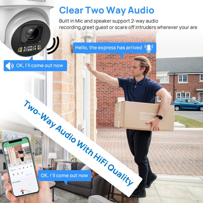 - Smart Human/Vehicle Detection & 2 Way Audio: When the ptz camera outdoor detects a person or vehicle, it will send email and push notifications to your device. Our smart AI analysis minimizes false alarms caused by bugs or falling leaves, saving your time and energy. You can customize the critical areas to receive notifications. Built-in microphone and speaker for real-time communication or to remotely scare away intruders