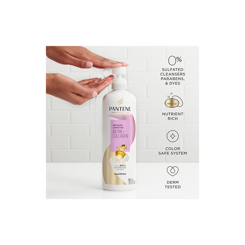 LESS BREAKAGE FOR INFINITE LENGTHS Trying to grow out those long locks? Help your hair reach infinite lengths with Pantene Pro-V Infinite Lengths Biotin + Collagen Sulfate-Free Shampoo. This formula fortifies weak, brittle hair for more resilient strands that are stronger to reach longer lengths, with up to 90% less breakage with this system. Our formula, crafted with Pantene Pro-vitamin B5, Biotin, and Collagen, gently cleanses and strengthens hair without drying or stripping locks. It's even safe for color-treated hair*, because you shouldn't have to sacrifice to get the length you want. So keep it growing, and keep it going strong.HOW TO USEIt's easy to reach infinite lengths! Just massage Pantene Pro-V Infinite Lengths Biotin + Collagen Sulfate-Free Shampoo all over your wet hair, paying special attention to the roots. Wait for one minute for the ingredients to work their magic. Then rinse thoroughly. For best results, follow with Pantene Pro-V Infinite Lengths Biotin + Collagen 1 Minute Miracle Conditioner