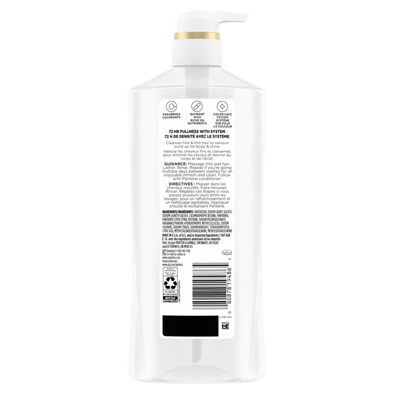 CLEANSES & VOLUMIZESGive your hair the ultimate boost. Pantene Pro-V Sheer Volume Shampoo is designed to give your hair the lift and fullness it craves. It hydrates while it lifts to ensure your hair looks healthy and ready for head-turning styling. Gently cleanses hair to remove buildup and reveal noticeable volume, lift, and control when styled. Pair with Volume & Body Conditioner and Volume Body Boosting Mousse for 72-hour fullness and unbelievable body.Our new and improved silicone-free formula offers 72-hour fullness and two times the pro-vitamins for luxury repair results without the luxury price tag. This nutrient-rich formula is packed with antioxidants and two times the amount of pro-vitamin B5 to help strengthen existing hair bonds and build new ones. Lift your spirits and your follicles with the scent of creamy berries.Perfect for use on fine or thin hair. Crafted to cleanse all hair types and is gentle enough for use on permed or color-treated hair. Free of parabens and colorants for no harsh stripping.HOW TO USE: Gently massage into wet hair. Focusing on the scalp and roots, work into a rich lather. Pull lather through to the ends of your hair. Rinse thoroughly. Repeat these steps if you’re going multiple days between washes for lasting freshness. For best results, continue with the Sheer Volume 72 HR Fullness Conditioner for root-lifting volume.