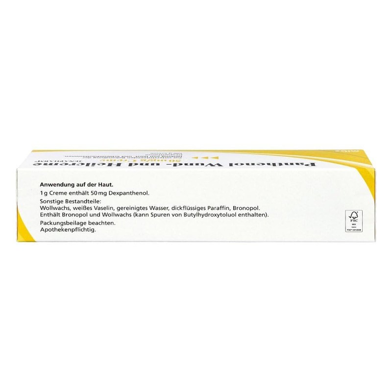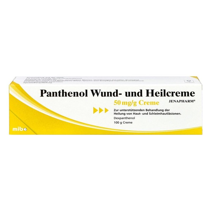 Ingredients: active ingredient per 1 g cream: 50 mg dexpanthenol. Other ingredients: wool wax (= butylhydroxytoluene), white petroleum jelly, thick paraffin, bronopol, purified water; Panthenol wound and healing cream JENAPHARM is applied thinly to the affected skin areas once or several times a day.