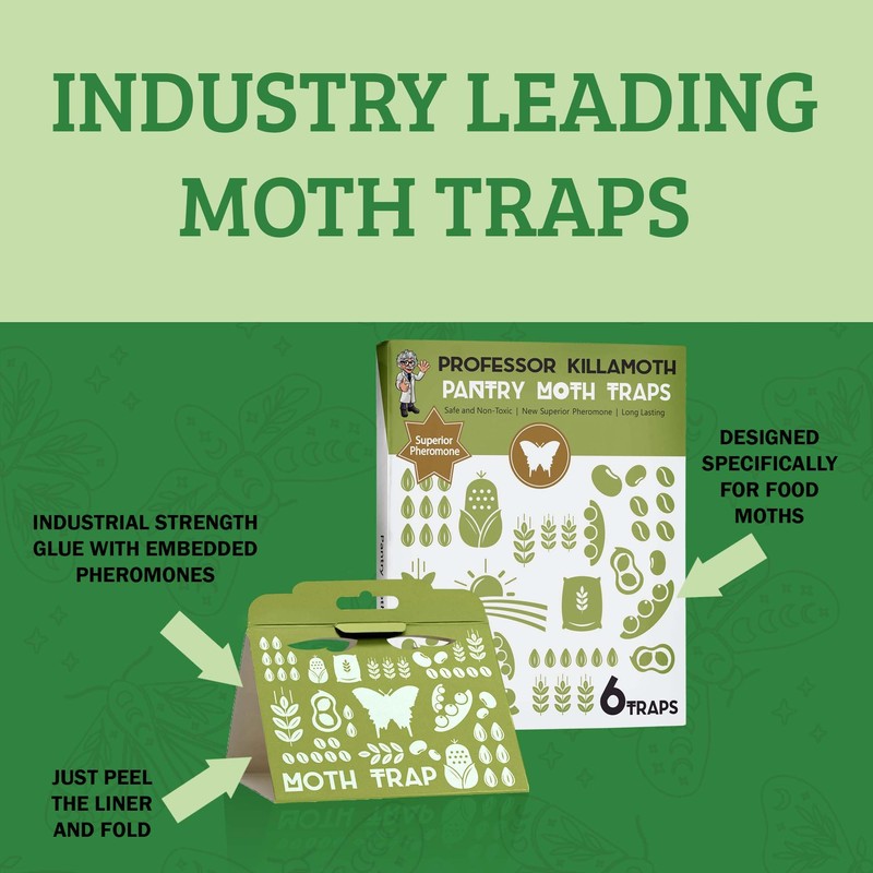 Professor Killamoth pantry moth traps will put an end to your costs and frustrations by trapping male moths and putting an end to the reproduction cycle that is trashing your food!