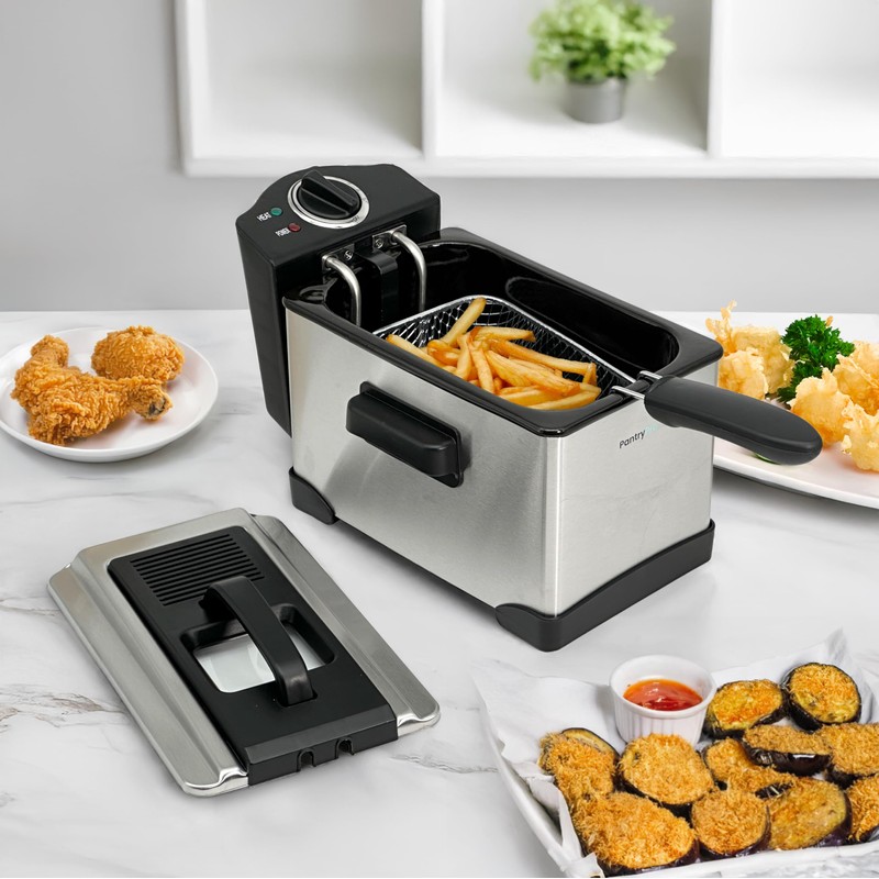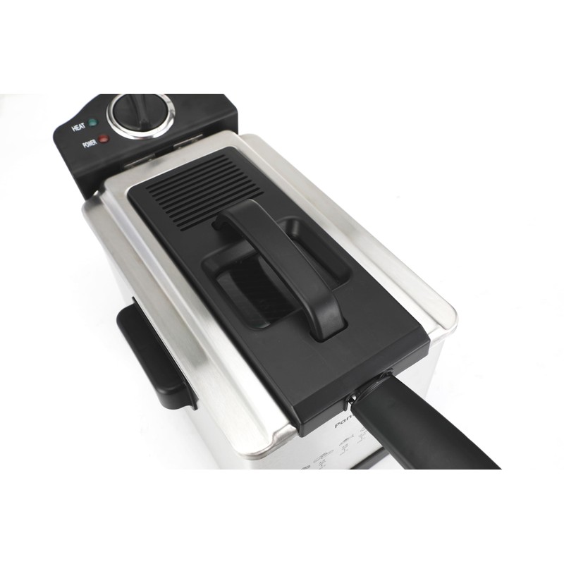 PantryPro 2 Liter / 2.1 Quart Stainless Steel Immersion Electric Deep Fryer, 1400 W, Temperature Control, Basket with Hook, Odor Filter, Lid w. Viewing Window